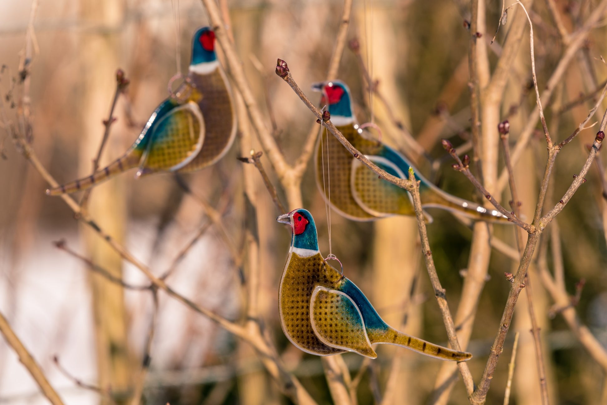 Fasanen vandrer som et levende maleri gennem landskabet – hanen i glitrende kobber, grønt og guld, hunnen i blød jordfarvet harmoni. De er både pragt og ydmyghed, styrke og skjul, lys og skygge. Når fasanen letter, er det med et pludseligt brus, som om marken selv gav slip på en hemmelighed.